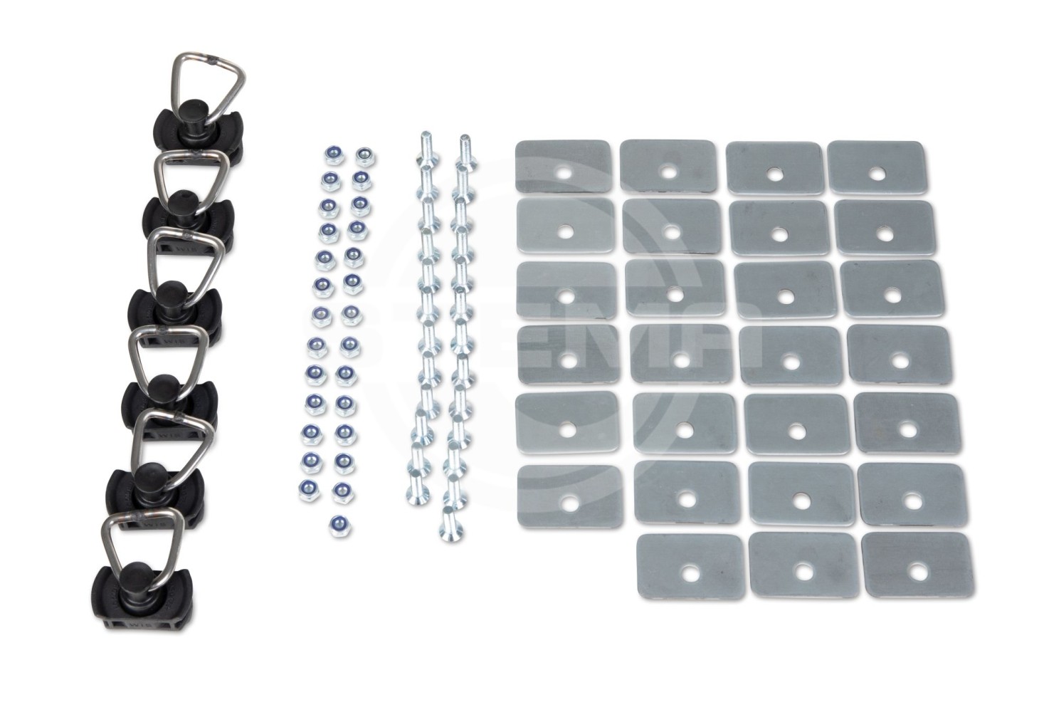 Der Set besteht aus einer Airlinerschiene mit sechs Fittingen, welche als zusätzliche Verzurrpunkte ihrem Anhänger dienen. Diese können beliebig justiert werden.